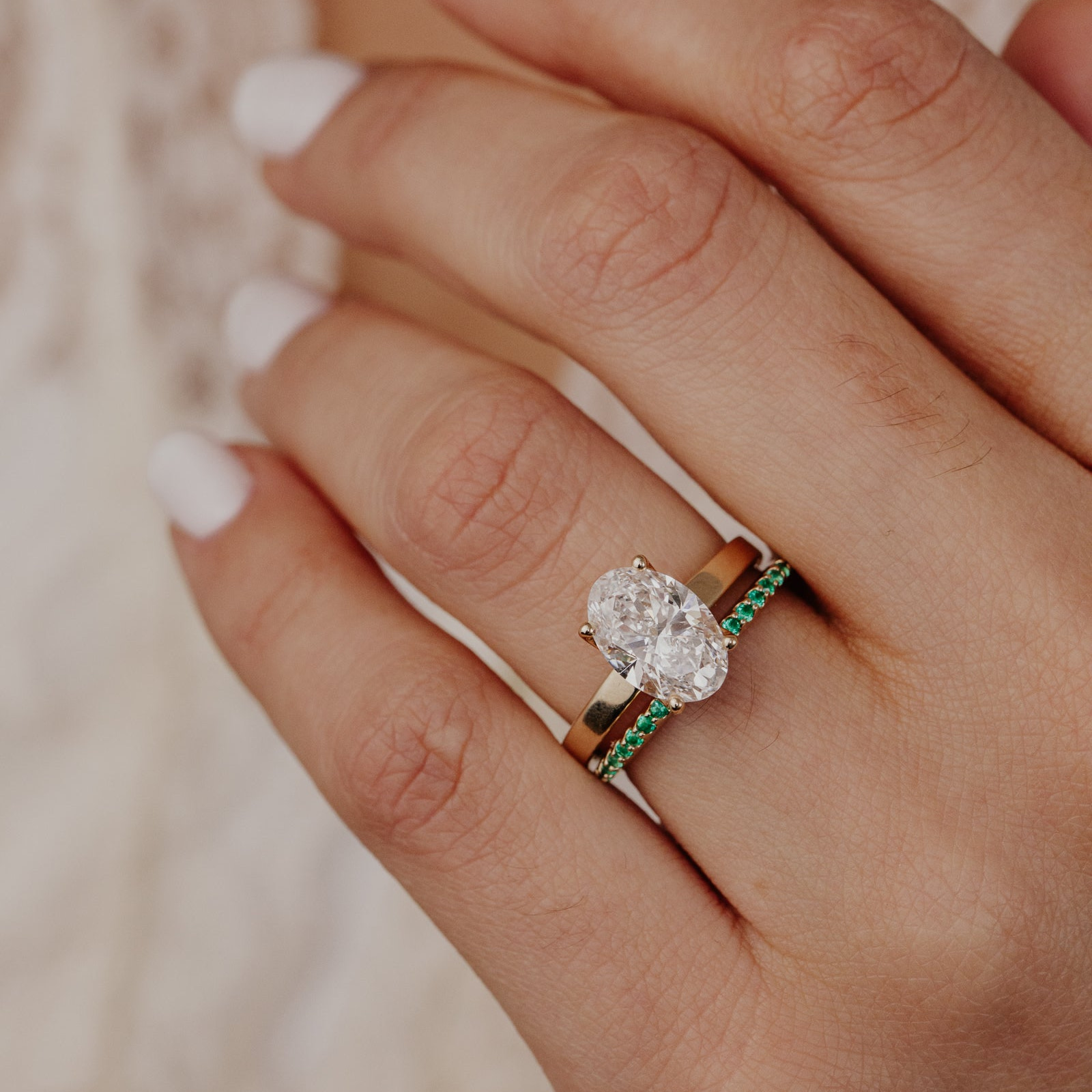 Create interesting contrast between your engagement and wedding ring with this stacking technique. Try pairing a diamond engagement ring with a solid gold wedding band, or pairing diamonds with gemstones. And, consider the level of contrast—the differences can be subtle or in-your-face to create completely different effects.