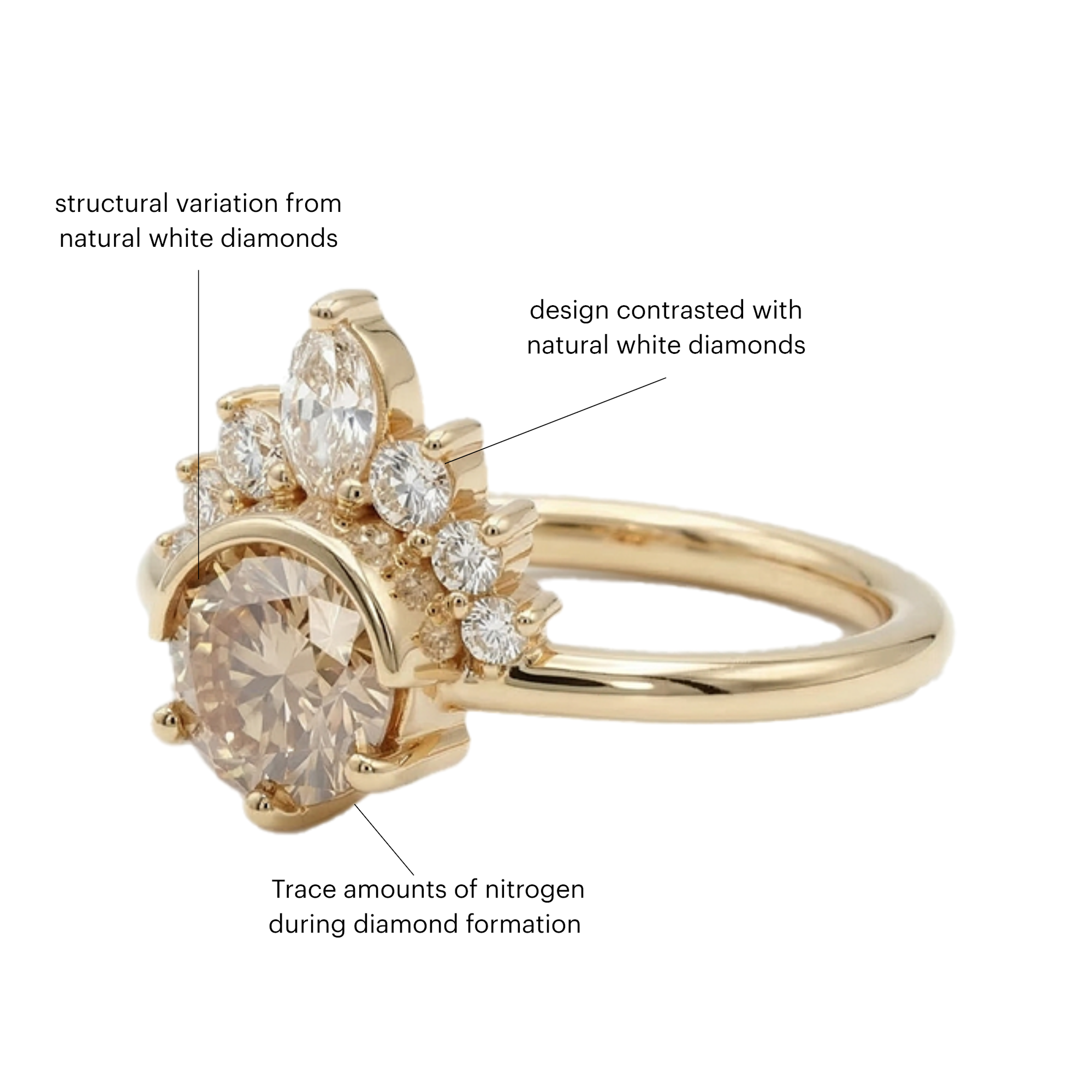 Champagne diamonds owe their warm, golden hues to trace elements and subtle structural variations formed deep within the earth.